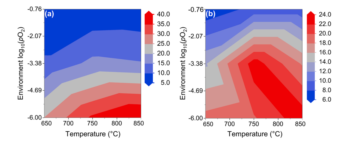 等高线图进一步揭示:惰性气氛+高温区域(>750 °C, log pO₂≈-6)可获得最大中位粒径(≈40 nm),但晶粒尺寸在 24nm 趋于平台,提示颗粒呈多晶结构;而在空气气氛下,粒径被限制在 6–8nm,晶粒尺寸同步受抑,源于 Ni→NiO 转变后强烈的离子键限域效应。