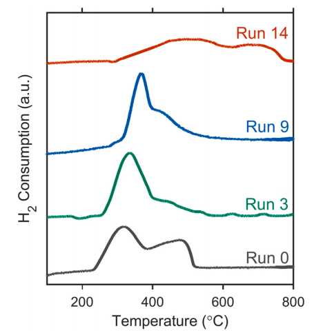 催化剂在合成状态(Run 0)以及在 750 °C 下经 8 小时不同气氛热处理后的 H₂ 消耗量(TCD 信号)。气氛分别为:惰性(Run 3)、微氧化(Run 9)和空气(Run 14)。TPR 峰表示氢气消耗,即催化剂的还原温度。