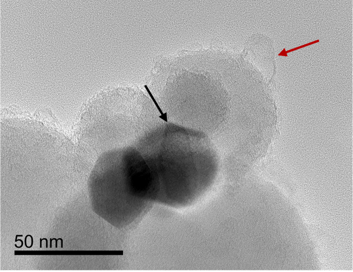经热处理的 Ni/SiO₂ 催化剂(Run 5)的代表性明场 TEM 图。红色箭头标示残余碳,黑色箭头指出 Ni 孪晶界,显示单个 Ni 颗粒内存在两个 Ni 晶粒。