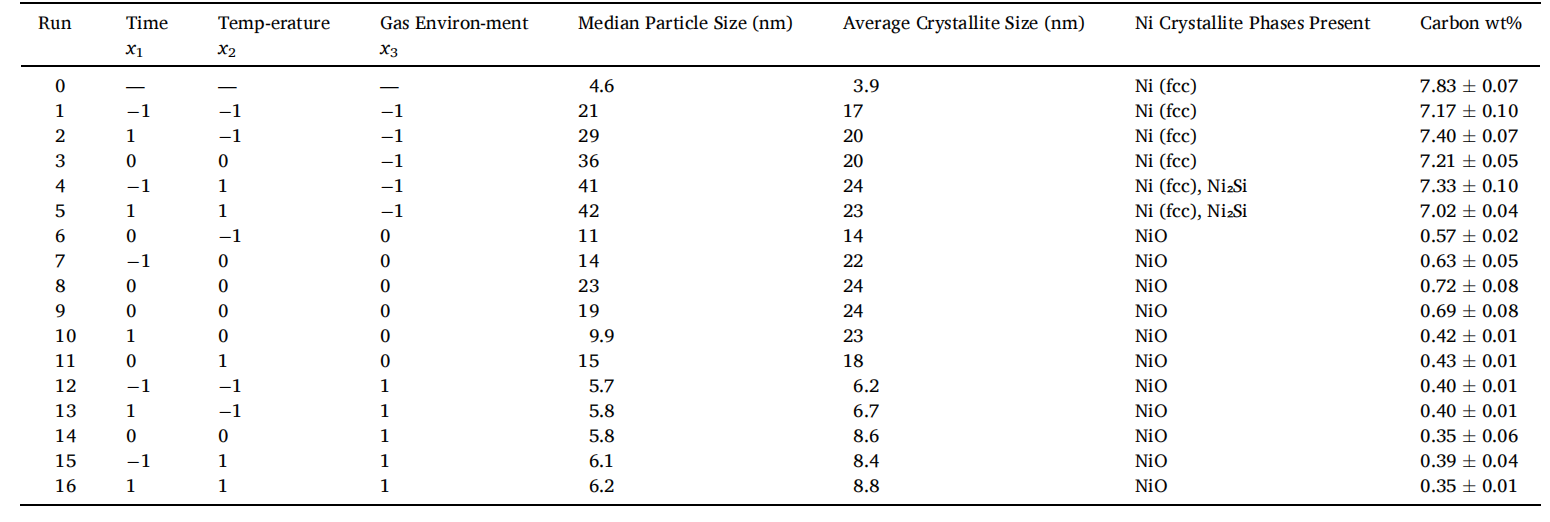 Ni/SiO₂ 催化剂热处理的面心中心复合设计矩阵。表中给出了在不同时间 (x₁)、温度 (x₂) 和 log₁₀(pO₂) (x₃) 水平下的实验响应值:中位粒径 (Y₁) 与平均晶粒尺寸 (Y₂)。Run 0 为起始点,即合成态催化剂。中位粒径由 SAXS 体积分布计算,平均晶粒尺寸及晶相由 XRD 测定;碳含量采用 LECO 燃烧法测定。