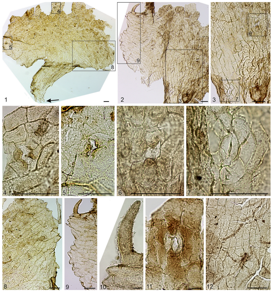 产自俄罗斯北极新西伯利亚群岛科特利内岛阿普特–阿尔比阶Balyktakh组。图1–6为杯瓣表皮气孔的激光共聚焦显微图;图7、9–12为扫描电镜图,图8为光学显微图。