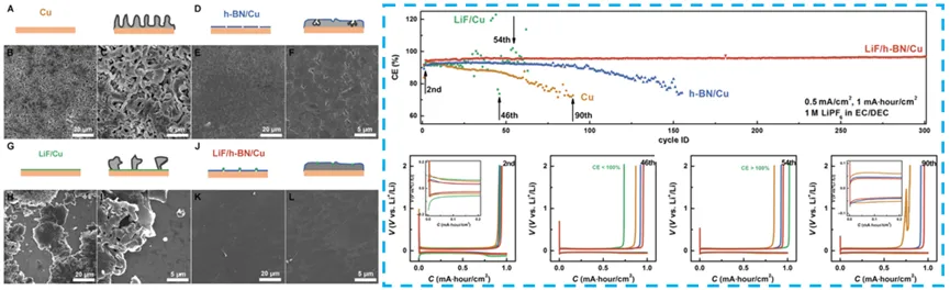 Cu、h-BN/Cu、LiF/Cu 和 LiF/h-BN/Cu 基板上重复镀锂/剥离后的(左)SEM图像;(右)循环性能[4]