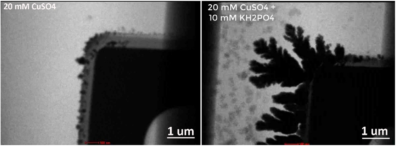 随后,样品源中的电解质使用CuSO₄和KH₂PO₄ 溶液的混合物进行实验。该液体以3微升/分钟的流速保持流动15分钟,这使研究人员能够直接研究电解质对同一液体电池中沉积的影响,排除了不同电池组装过程中的所有不确定性。与此相反的是,在这种情况下,观察到铜树枝的生长,电解质中加入H₂PO₄-离子导致了Cu-磷酸盐复合物的形成(见图1,右)。这些结果进一步证实了能够调节电解质成分的重要性,并证明了Stream样品杆所能实现的环境控制的有效性。