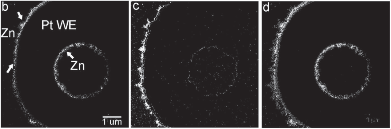 在前面的实验中研究铜电沉积时,研究人员看到,树枝状晶体的形成可以通过原地添加外来离子(如磷酸盐)来进一步促进。为了证实这种技术的普遍性,研究人员还观察了 ZnSO₄ 水溶液中的Zn电沉积。下图显示了在b)较低的电位-0.9V(相对于Pt)的前10秒中锌层的总增长,以及c)较高的电位-1.1V(相对于Pt)的后10秒锌层的增长。在d)中,显示了前20秒中锌沉积物的总增长情况。研究人员在前10秒(-0.9V)观察到,与外缘相比,内缘的沉积更粗糙。在接下来的-1.1V的生长过程中,树枝状沉积物在之前的外边缘成核并生长,而在内边缘则无法观察到进一步的生长。这个实验表明,Stream样品杆的特殊电极设计能够在不同的化学环境中探索丰富的液体动力学信息。