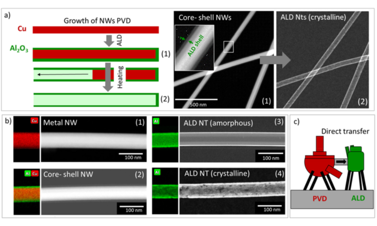 最近,Lilian Maria Vogl 等人介绍了一种无需湿法流程、系统且简便地制备高质量氧化铝纳米管的方法。作者通过使用自搭建的化学气相沉积(PVD)-原子层沉积(ALD)系统(如图1)制备纳米管,再对所得非晶态纳米管进行退火处理,最终所得氧化铝纳米管长径比大约 1200、最小壁厚小于 4 nm。随后,作者借助 DENS Wildfire TEM 原位加热样品杆进行 TEM 原位加热实验探究了整个制备过程,解释了纳米管的生长机制,探讨了制备高质量纳米管的影响因素。