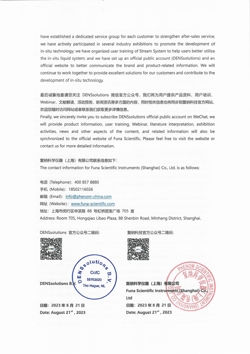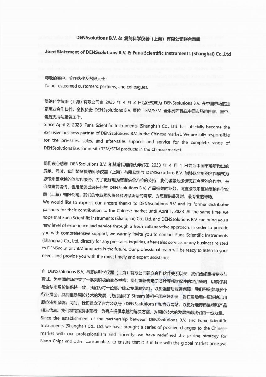 Joint Statement of DENSsolutions B.V. & Funa Scientific Instruments (Shanghai) Co.,Ltd