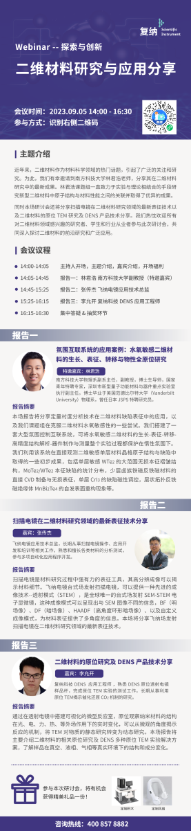 为此,我们有幸邀请到南方科技大学林君浩老师,分享其在二维材料研究中的最新成果。林君浩课题组一直致力于实验与理论相结合的手段研究新型二维材料中原子结构与材料性能之间的关联。实验室具有成熟的电镜表征与制样技术,目前已经初步建成了一套总投资达 800 余万人民币的新型手套箱互联系统,可以实现在隔绝水氧与控制环境微粒度的条件下实现从样品生长、转移、表征到器件制造的整个过程。同时本场研讨会还将分享扫描电镜在二维材料研究领域的最新表征技术以及二维材料的原位 TEM 研究及 DENS 产品技术分享。