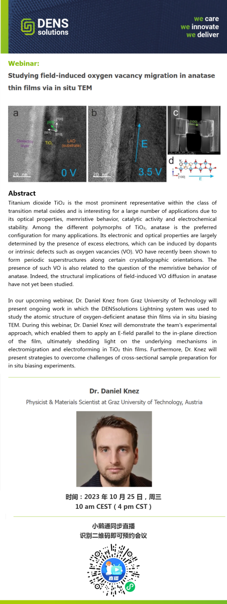 DENSsolutions 即将于 10 月 25 日北京时间下午 4 点举行线上研讨会,主题为“通过原位 TEM 研究锐钛矿薄膜中场诱导的氧空位迁移”。本次研讨会将由奥地利格拉茨科技大学物理学家兼材料科学家 Daniel Knez 博士担任主讲人,Daniel 博士将在本次研讨会介绍其正在进行的工作:使用 DENSsolutions Lightning TEM 原位热电系统研究缺氧锐钛矿薄膜的原子结构。我们诚挚邀请您共同参与这场研讨会,共同探讨材料科学领域的最新研究动态。