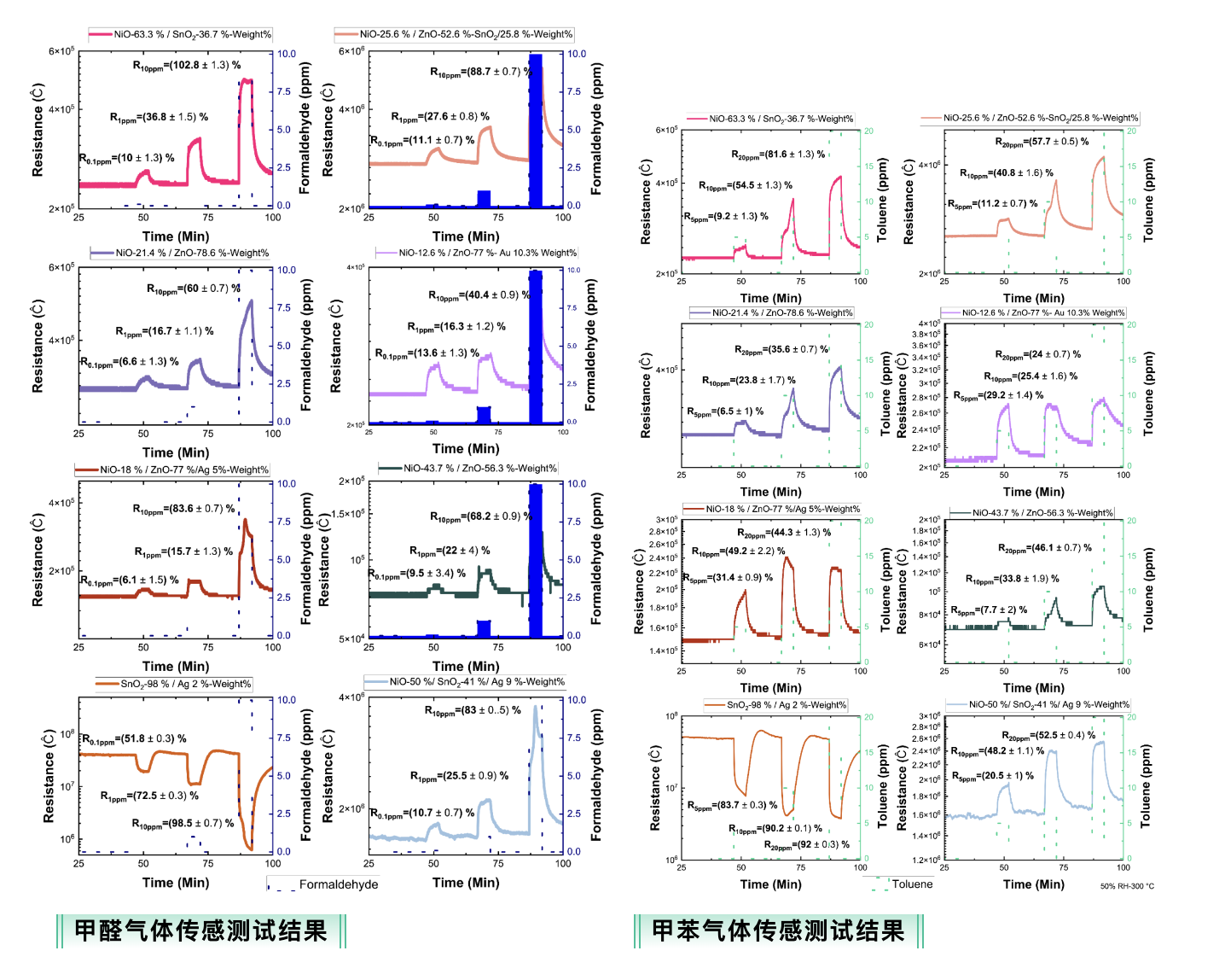 在本案例中,基于金属氧化物半导体(MOS)及金属催化剂的纳米多孔层(NPLs)通过印刷方式沉积在多传感器阵列平台上,并以甲苯和甲醛作为目标气体进行测试。最多三种不同组分的 NPLs 被用作传感层。研究从灵敏度、选择性、响应/恢复时间及检出限(LOD)等关键性能指标出发,系统分析了材料组成对气体传感性能的影响。