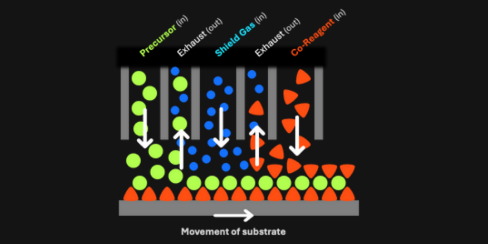 DALP 的工作原理基于空间原子层沉积技术,在空间层面分离化学前体和反应物,并利用微喷嘴系统将它们独立输送到基板上的特定位置。这确保了化学反应仅在目标区域内发生,从而减少交叉污染并提高精度。该工艺可实现微米级横向分辨率和纳米级厚度精度控制。