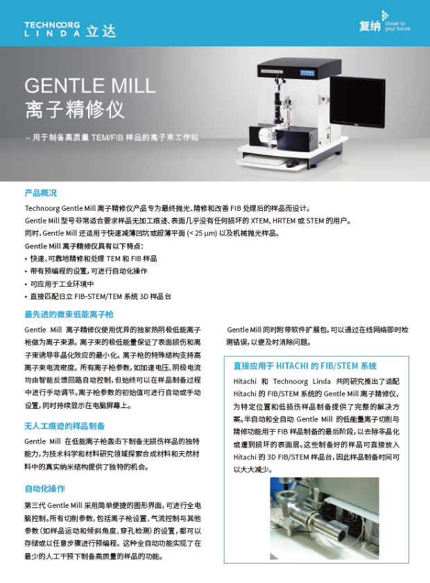Hitachi 和 Technoorg Linda 共同研究推出了适配Hitachi 的 FIB/STEM 系统的 Gentle Mill 离子精修仪,为特定位置和低损伤样品制备提供了完整的解决方案。半自动和全自动 Gentle Mill 的低能量离子切削与精修功能用于 FIB 样品制备的最后阶段,以去除非晶化或遭到损坏的表面层。这些制备好的样品可直接放入Hitachi 的 3D FIB/STEM 样品台,因此样品制备时间可以大大减少。